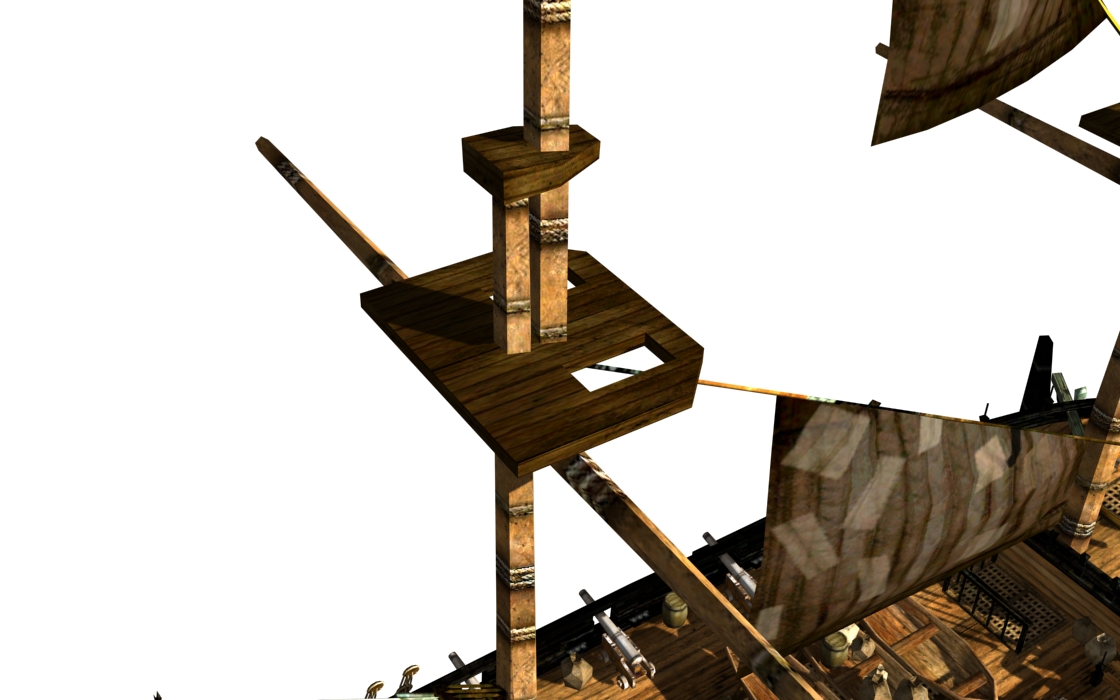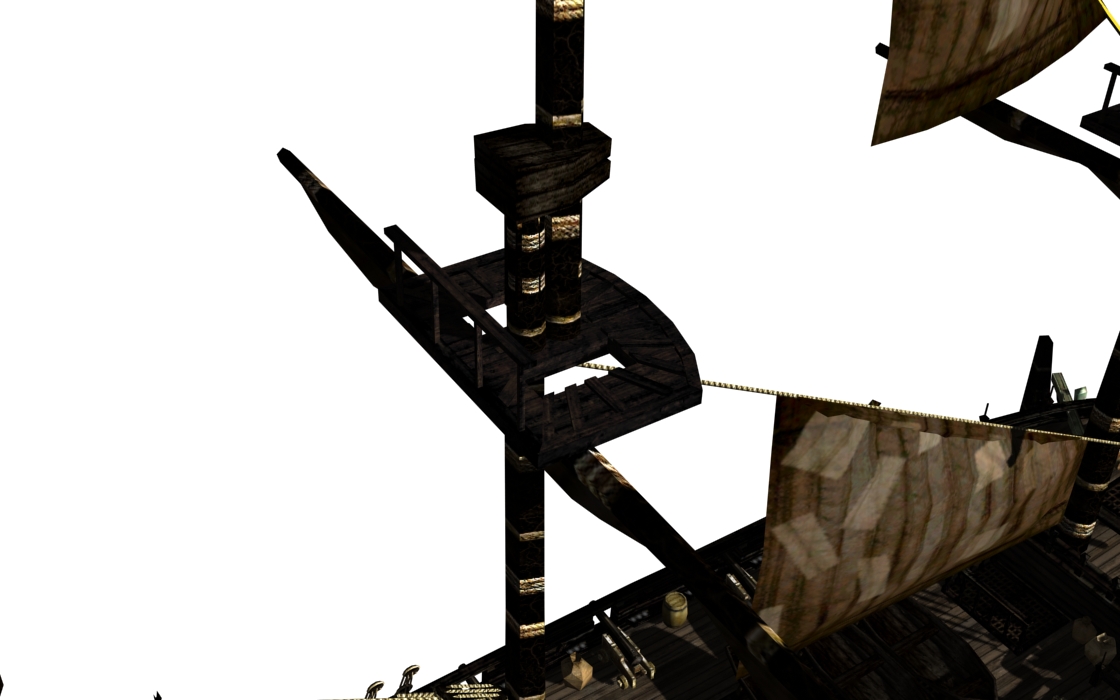 Here's the new crows nest. I've made it so you can actually walk up on the path file and reach it, although I'm not sure about the view :D This part of the mast is actually part of the ship, to avoid the situation where you could loose the mast, but still capable of climbing on now non-existing nest via unchanged path file - the "real" mast starts above crows nest.